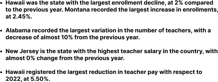 Scholaroo analyzed the current condition of public schools in the United States, showing specific characteristics such as teacher and instructional staff salaries, public school districts in operation, and the total number of students enrolled in public schools, among others, to better understand their situation across the country.